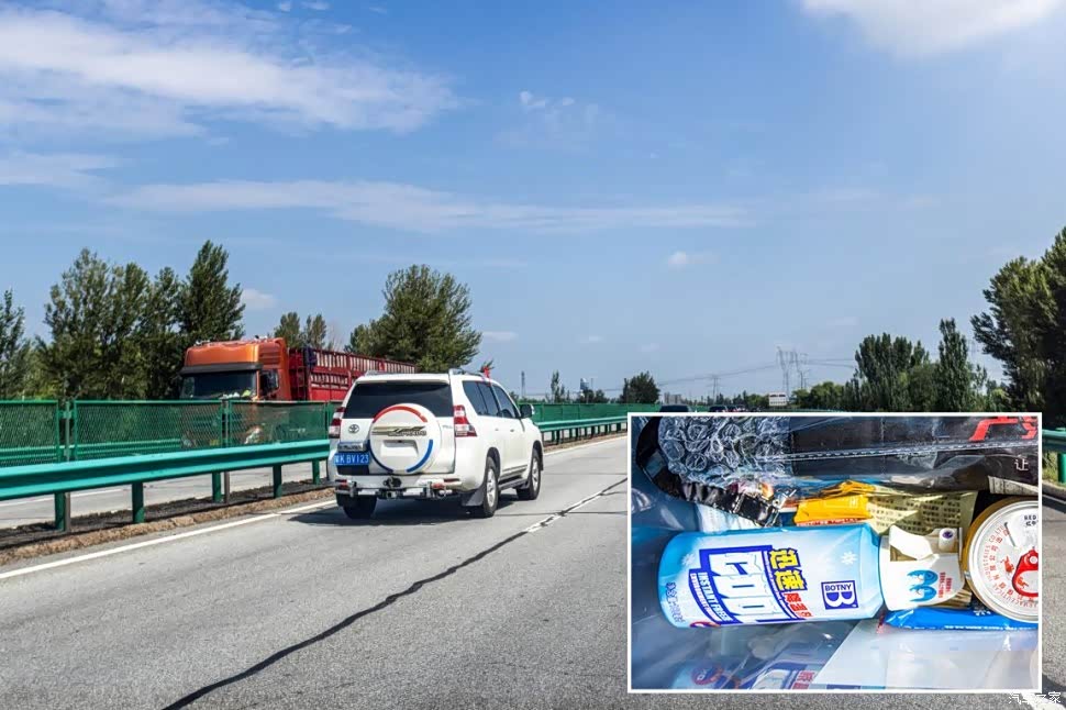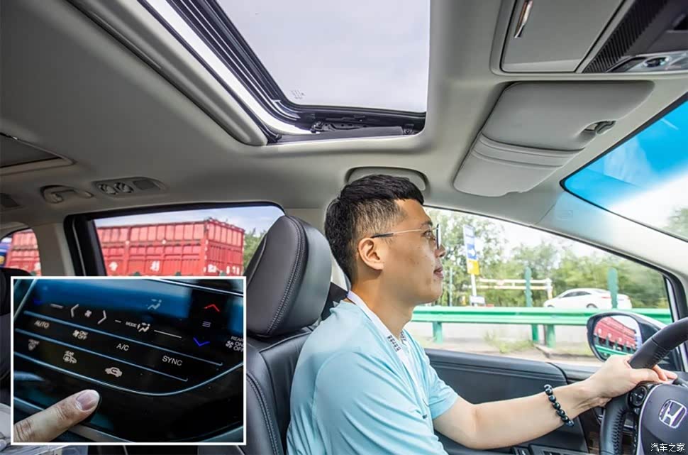 虽说是内蒙,但架不住太阳晒啊,开着开着也觉得有些热了,为了破纪录空调肯定是不能开的,于是把天窗后部翘起,再把空调调到外循环,这下出风口的风就变得更大些。