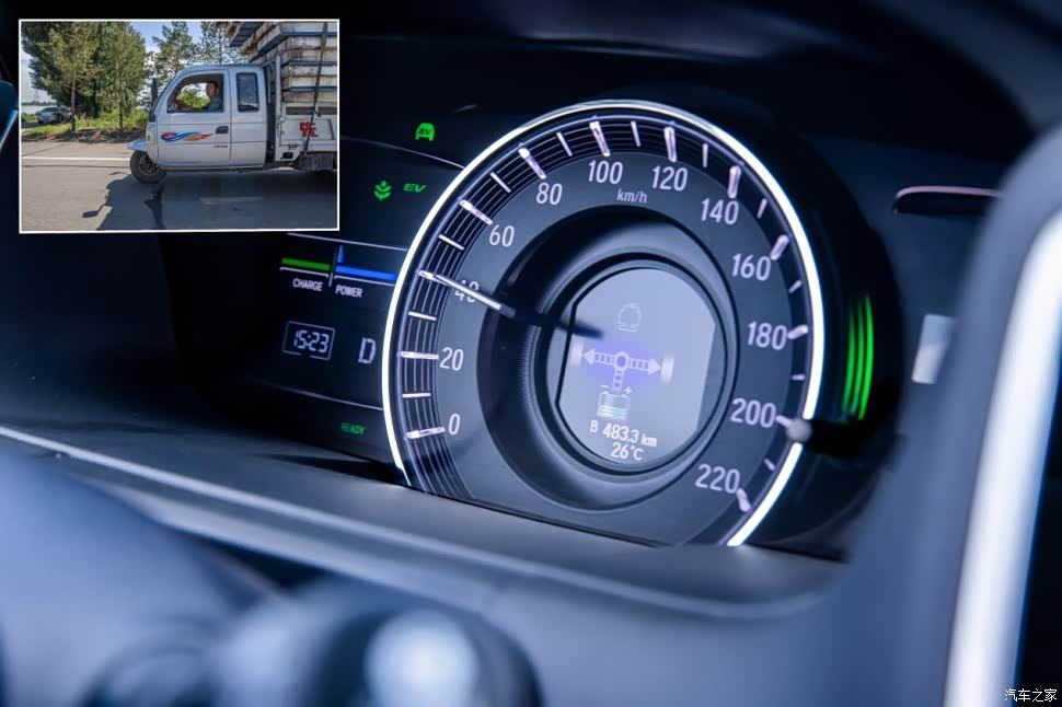这段冲刺路线都是平路,没有坡道,利用不了惯性,所以考验我们技术的时候到了,我们决定先在有电的情况下,把车速提起来,大概到40km/h左右EV模式就会自动取消,然后松开油门溜车同时用惯性给电池充电,当溜到20km/h时,再强制开启EV模式踩油门把速度提到40km/h,这样反复操作,希望可以尽量的不用汽油,我们给它起了个名字叫永动机模式。
