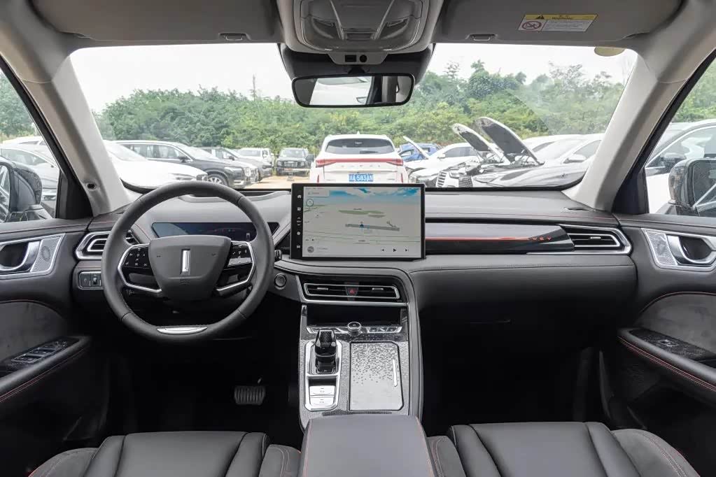走进车内,内饰采用环抱式座舱设计,中控台线条十分简洁,黑+绿撞色色调的设计让整体极具科技感。方向盘为三辐式多功能方向盘,搭配尺寸夸张的曲面大屏、液晶仪表等,内饰质感十分出色。