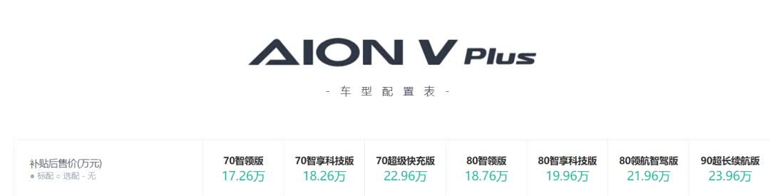 近日,选车网获悉,作为广汽埃安AION V的改款车型,广汽埃安AION V Plus已于9月29日正式上市。新车针对外观和内饰均进行了更新,除此以外还搭载了最新的超充技术。本次共推出7款车型,补贴后售价区间为17.26-23.96万元。新车按照续航里程可以分为70、80以及90版本,其中最高版本的NEDC续航里程为702km。