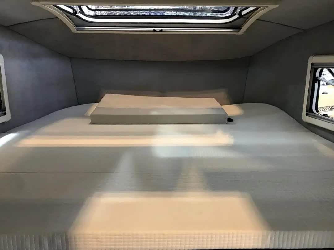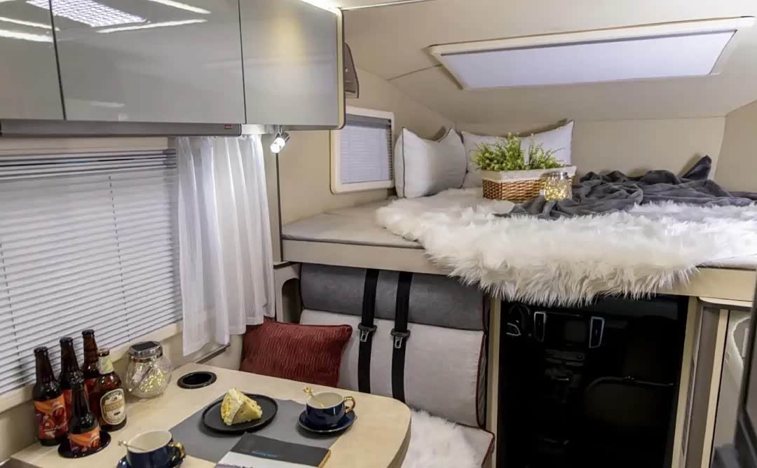 不仅如此,新车的内饰主要以灰色系的内装进行装饰,这使得家庭的温馨感油然而生,四个座椅对座形成沙发餐桌区域,额头区域是双人床,侧面和顶部都有采光。至于床铺的细节,新车配备了1.7米×1.95米的床铺,足够两人使用。除此之外,后仓还配有厨房,橱柜布置在下面,厨房内有电磁炉、抽油烟机、微波炉、冰箱等电器。遗憾的是,受限于车身尺寸的问题,洗浴区域没有设置。