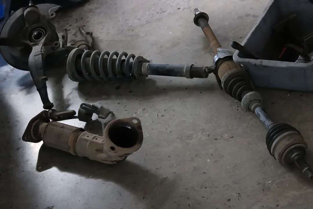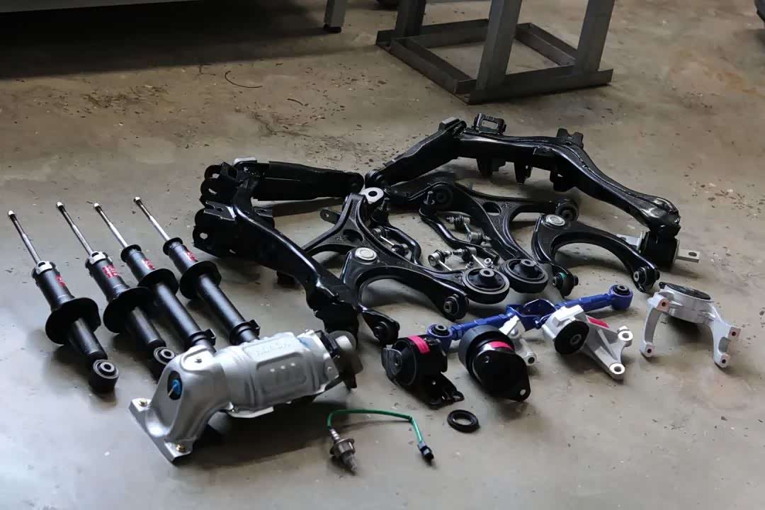底盘系统更新,又要老生常谈了,日系车没有单独胶套更换,厂商不提供、品牌件不提供,所以只能选择原厂件,这一地配件包括:避震+各种摆臂+拉杆+球头+支臂+支架+三元催化器。