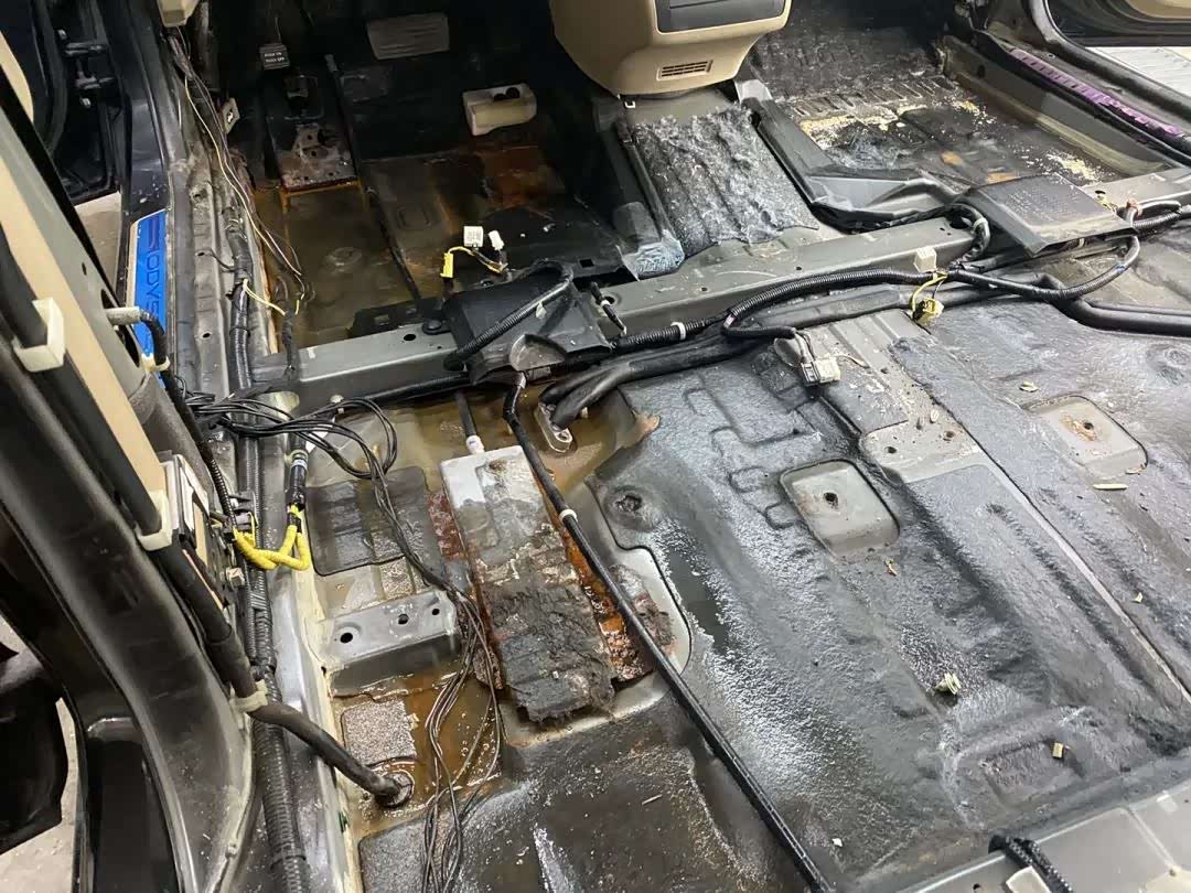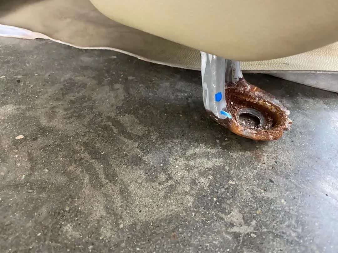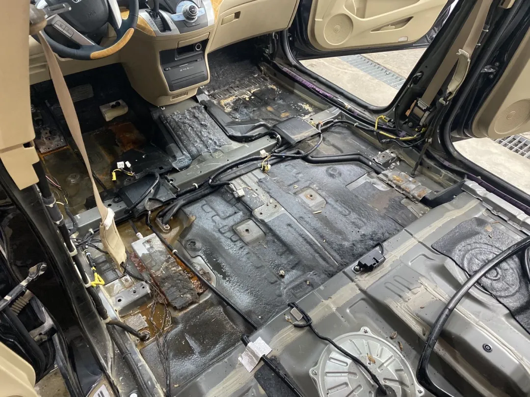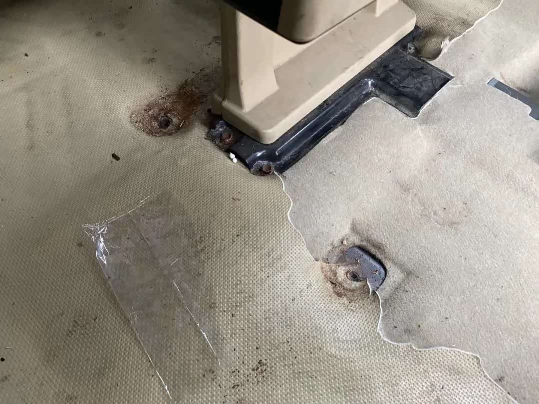 我一看,怎么座椅支架的螺丝位置都快锈烂了?地胶下面究竟什么个情况?