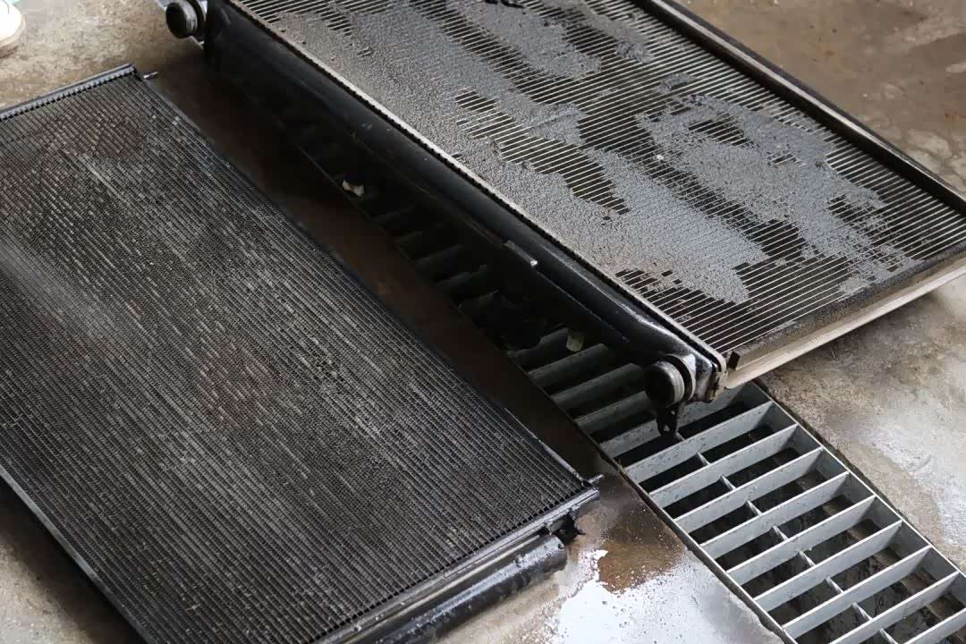 拆掉水箱、冷凝器做一下清洗,这是第二遍清洗了,刚拆下来的时候,都被泥土封实了。