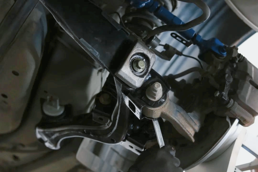 后下摆臂胶套老化产生裂纹了,看到锈迹斑斑的部件,其实日系车耐锈性也很一般的。