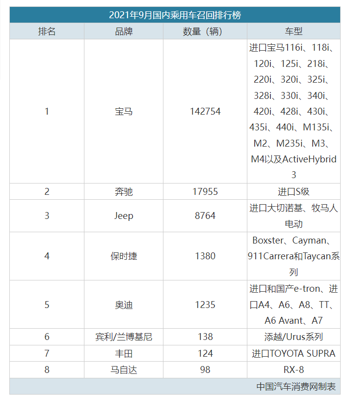 看完了榜单,毫无悬念,宝马绝对是最抢眼的那个,共14万多辆的进口车被召回,由此宝马的质量也被打上了问号!