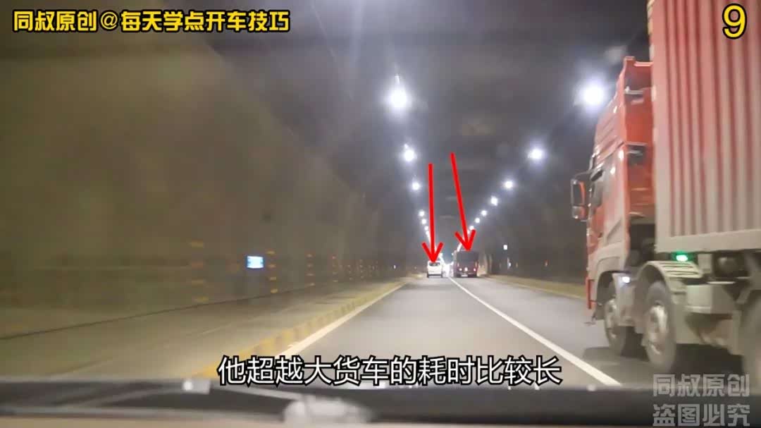第五,避免并行。两车道隧道的行车秩序相对好一些,大货车在这个隧道内也不会轻易变道,除非右侧车道前方遇到障碍物。可以看到前方小型车,他超越大货车的耗时比较长,这样就长时间处在与大货车并行中。