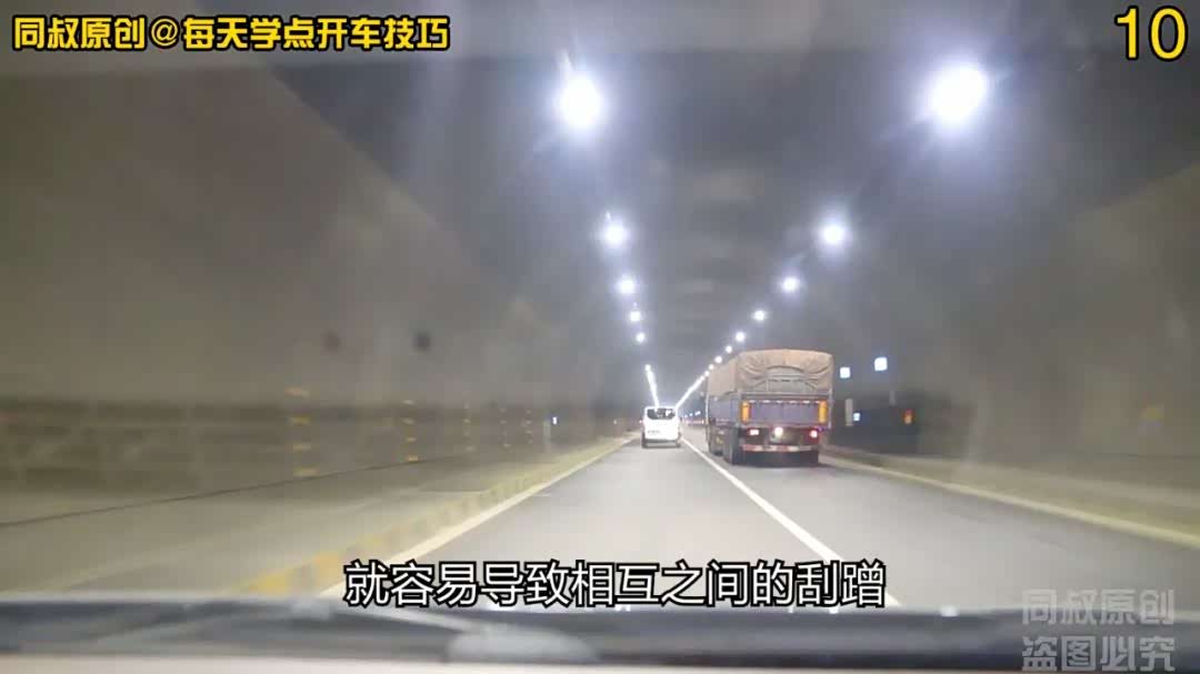 由于隧道内空间局限,右侧并无应急车道,左侧也是紧邻一个台阶,车辆稍有跑偏,就容易导致相互之间的刮蹭。特别是那种货物裸露的大货车,还有发生货物坠落的可能。因此能超就尽快,超不过,就要与大货车保持一个交错的状态,会更安全一些。