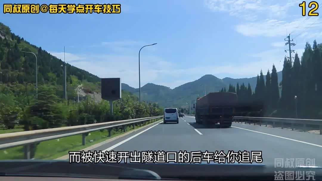 所以,出隧道口的车辆开出隧道口以后不要减速,匀速驶出在看清前方路况后,再加速驶离,防止因减速而被快速开出隧道口的后车给你追尾。