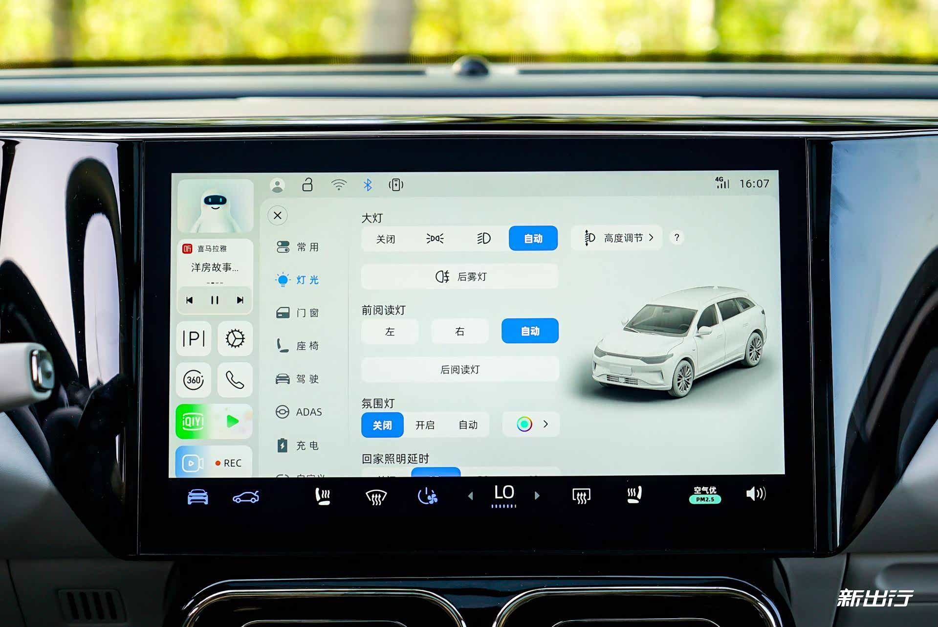 往下就是灯光设置,在灯光设置里包括了自动大灯、大灯高度调节以及氛围灯和回家照明延时时间的设置,最长是 60s。