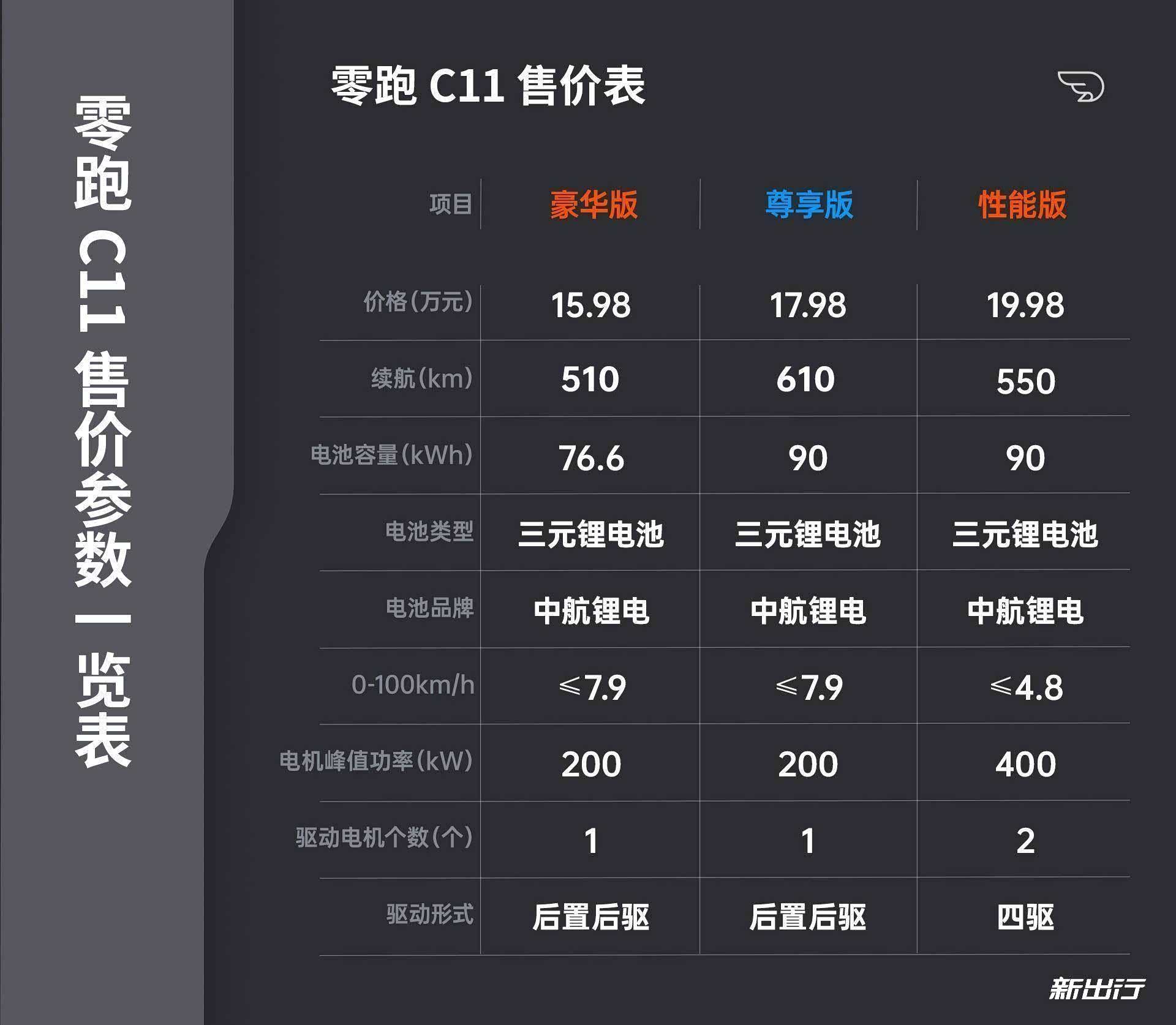动力及续航方面,零跑 C11 根据不同的配置以及用户需求共推出三款配置车型;