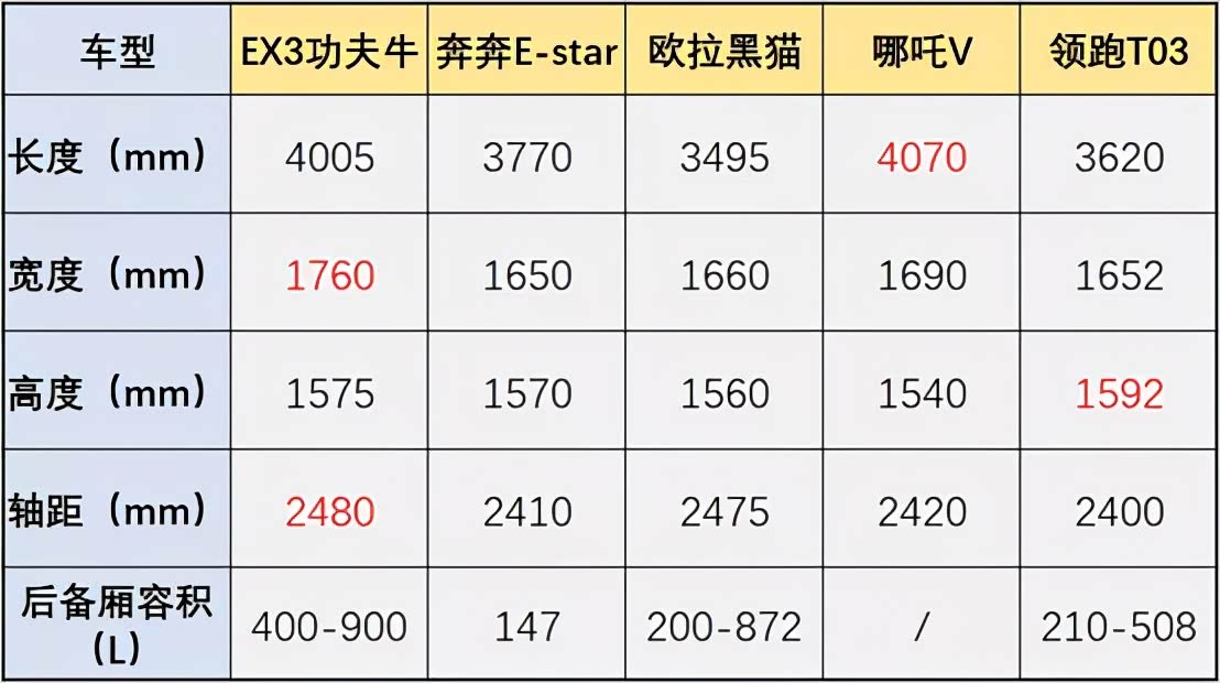 EX3|功夫牛的宽度和轴距是5款同类产品中最优的。