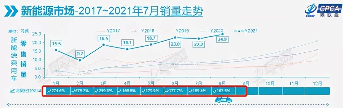 以刚过去的8月份为例,整体乘用车的零售销量约为145.3万辆,同比下跌14.7%,相比之下,新能源乘用车的同比增速却达到了167.5%!