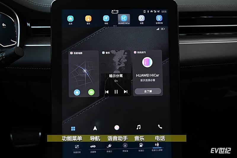 底部的快捷菜单从左至右依次是:功能菜单、导航、语音助手、音乐和电话功能。