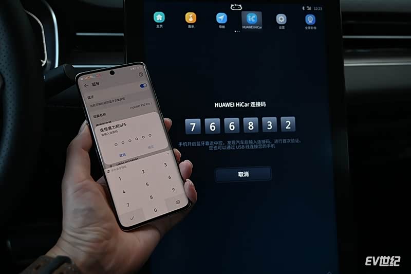 赛力斯华为智选SF5的HUAWEI HiCar功能启动非常简单,车机端直接点击屏幕顶部通栏中的“HUAWEI HiCar”功能图标,即可获得一个连接码。然后在手机端首先打开蓝牙,并进入“设置”—“更多连接”—“ HUAWEI HiCar”菜单内,即可搜索到对应车辆,输入车机大屏上的连接码,便可以启动这一功能。