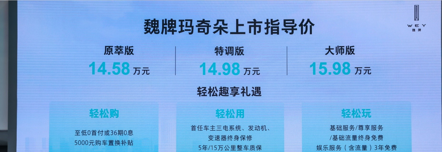 2021年9月29日魏牌玛奇朵天津车展上市。新车共发布3款车型,售价14.58万元-15.98万元。基于同摩卡的咖啡智能平台打造的紧凑型SUV。动力上,搭载1.5L+DHT100”的柠檬混动系统。