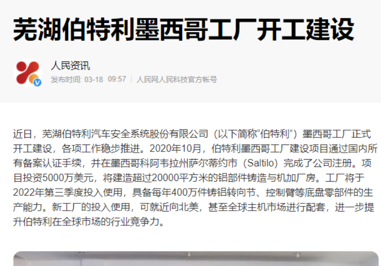 一提及零配件体系,知名度最好的依然是国际厂商占据主流,爱信、大陆、博世、德尔福等等可谓是耳熟能详,中国汽车工业虽说起步较早,但是真正跨入家用时代还是本世纪之初,掰着手指算起来甚至都不到二十年,之前用合资换技术的思路只能说是起到了一定的铺垫作用,培养了一批技术人才和普通的零配件体系建设,真正的做大做强其实还是随着自主品牌的崛起,近几年的事,而奇瑞就是较早开始自建零配件体系的车企之一,虽说不是各个都顶尖,但是多年的培养,还是有几个拿得出手的,其中就包括芜湖伯特利汽车安全系统有限公司(以下都简称伯特利),而新近曝光(9月12日)的信息伯特利在墨西哥建厂,目标非常明确,军马未动粮草先行的思路,够低调吧!相比之下有的车企厂还没建,就开始满世界嚷嚷。