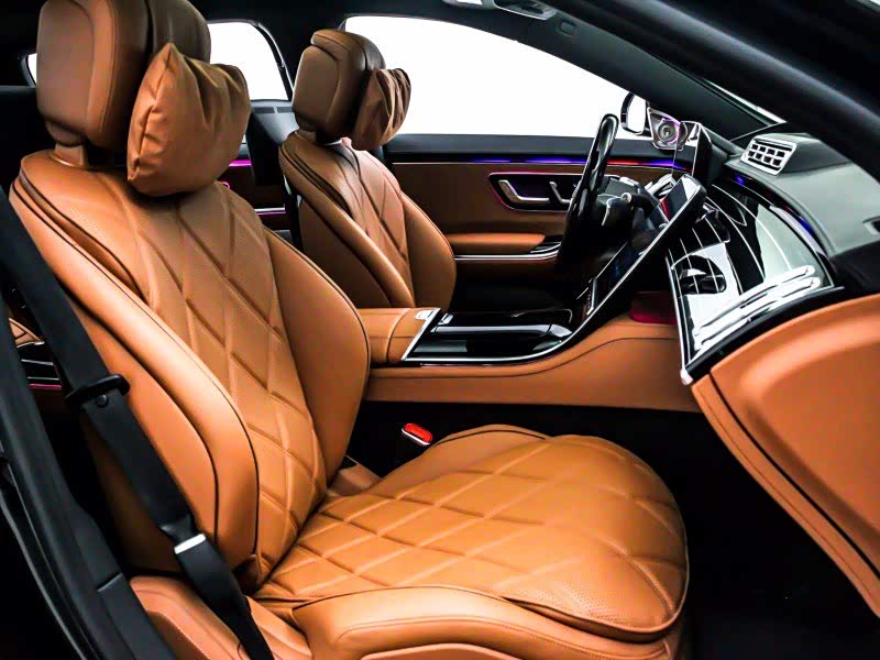 来到车内,这套棕色+黑色的内饰给人一种高档的感觉,中控采用对称布局,12.3英寸的悬浮式液晶仪表盘+12.8英寸的中控多媒体屏幕营造了很强的科技氛围,配置方面,配备有并线辅助,车道保持辅助系统,车道偏离预警系统,道路交通标识识别,主动刹车安全系统,疲劳驾驶提示,360度全景影像,全速自适应巡航,自动泊车入位,自动空调等配置,座椅方面奔驰迈巴赫S580采用2+2的四座布局。