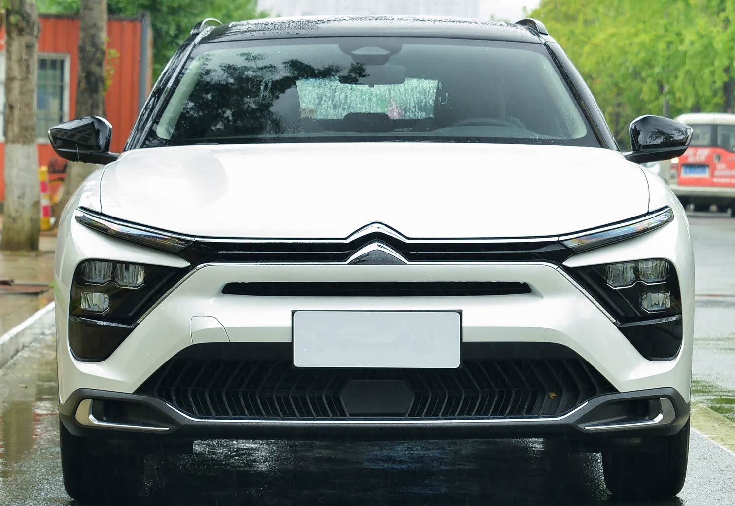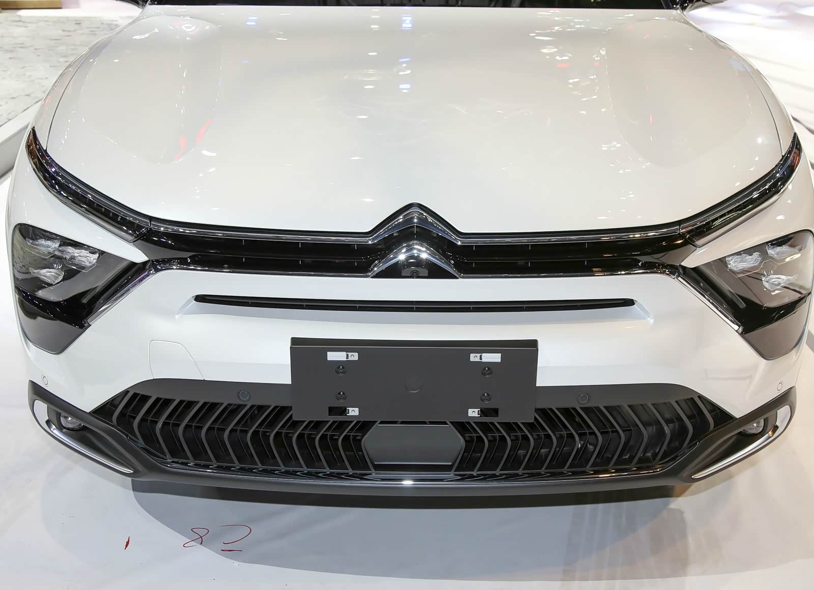 凡尔赛C5 X前脸采用“X”的造型,雪铁龙的品牌logo链接向两侧延伸的镀铬装饰线条,简洁明快。分体式大灯,上半部是条形的LED日间行车灯,下半部的LED灯加入了熏黑处理。再加上采用了大面积黑色网状的下格栅,透出一股运动气息。