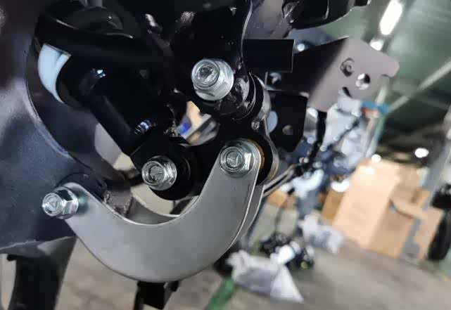 考虑到很多车友骑车环境恶劣,而且有需要带人的要求,R25M加强了烂路适应能力,专门升级了月牙摇架套件。之前的是滚针轴承容易撞坏,现在升级为越野车相同结构的黄铜衬套,而且月牙片经过淬火升级不会金属疲劳,同样适用R25。