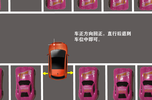 接下来看后视镜中,车尾开始向右甩,直到车正把方向回正即可。再对比左、右后视镜,如果你前面操作没有误差,这时候车体正好位于车位居中,直行后退到理想位置就完成了。