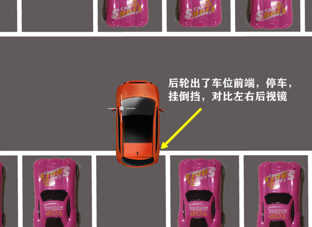 对于初学的新手司机,为了便于理解,可以挂前进挡前行,顺便把车摆正。当后轮出了车位前端后,可以停车,挂倒挡,对比左、右后视镜。你可以清楚地看到,车体与两边库边线呈一宽一窄状态(见上图)。