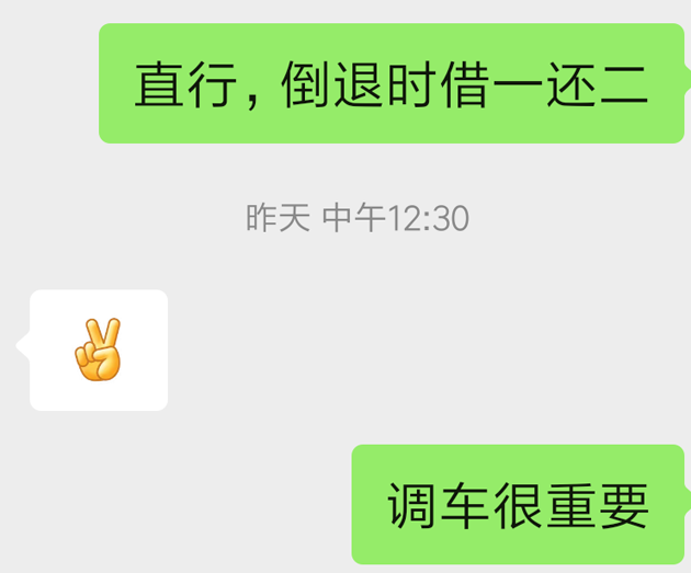 他在小区内的停车位,练习倒车入位,却发现总是出现一宽一窄的情况。不知道自己差在哪里?该如何解决。我给学员回复了几个字:前进直行,倒退时借一还二。几分钟以后,学员回复个ok的手势,问题解决了。