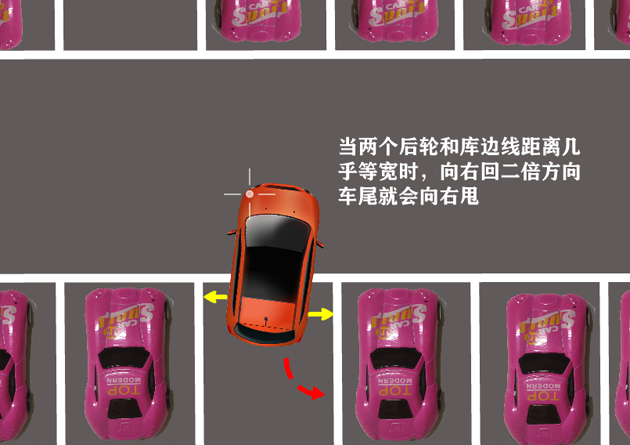 比如先向左打一圈,车尾就会向左甩。当你通过两个后视镜对比,发现两个后轮与两条库边线距离几乎等宽时(见上图两个黄色箭头),就向相反的方向回二倍轮,如果你刚才向左打了一圈,这时候就得向右回两圈。