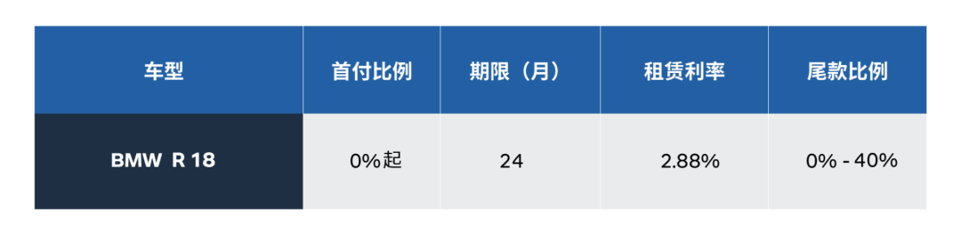 据小编了解到,现今BMW R18全系有0首付政策,利息更是低到“令人发指”。举个例子,购买指导价为249900元的R 18,车款可首付0元(购置税、保险另算),若贷款7成(174930元),2年总利息仅为(9614元),24期月供为7689.65元,最后一期仅需还款3成(74970元)。使你能够快速骑上R 18,开启专属于你的骑行之旅。