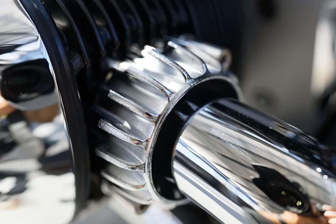 裸露在外的开放式传动轴,汽油燃烧后产生的动能,由变速箱经这根精致的传动轴传输给后轮,可视化的运转状态,是现代化工业中与众不同的美感设计。