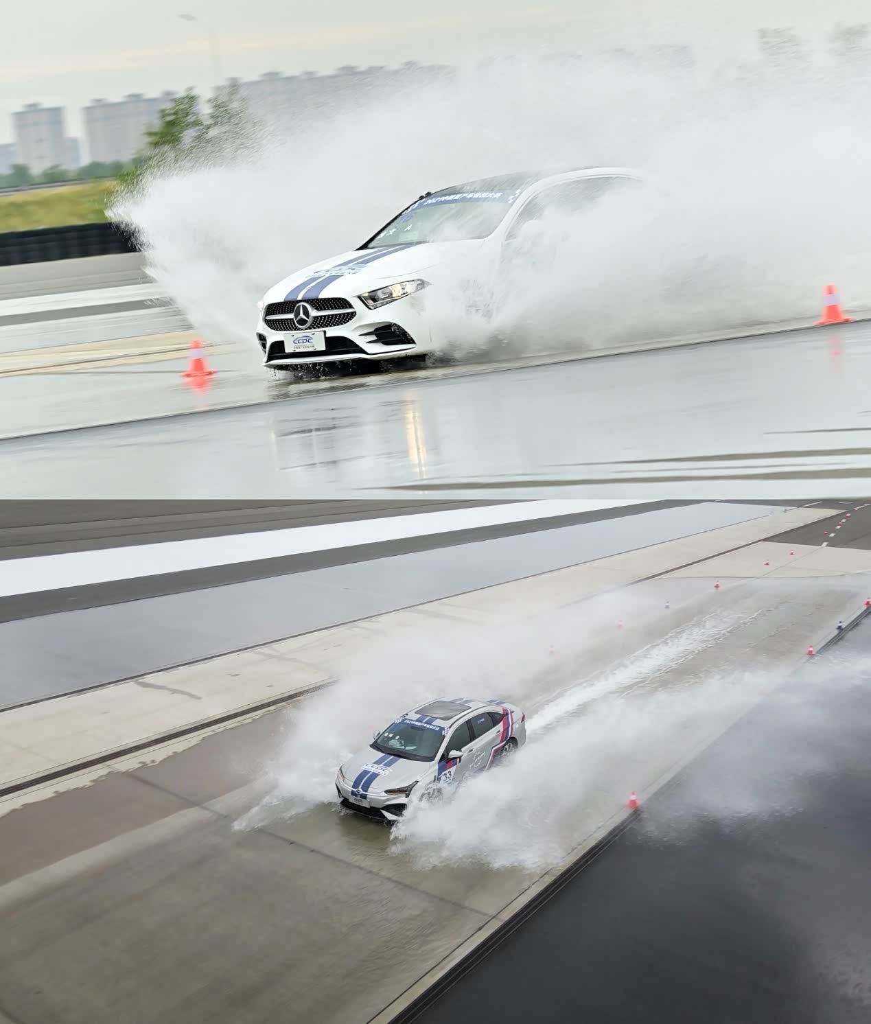 这项测试需要车手驾驶车辆,以60km/h的速度驶入积水深度40mm的测试道路并全力制动,模拟雨天极限制动场景,综合考核车辆的制动能力和制动稳定性。