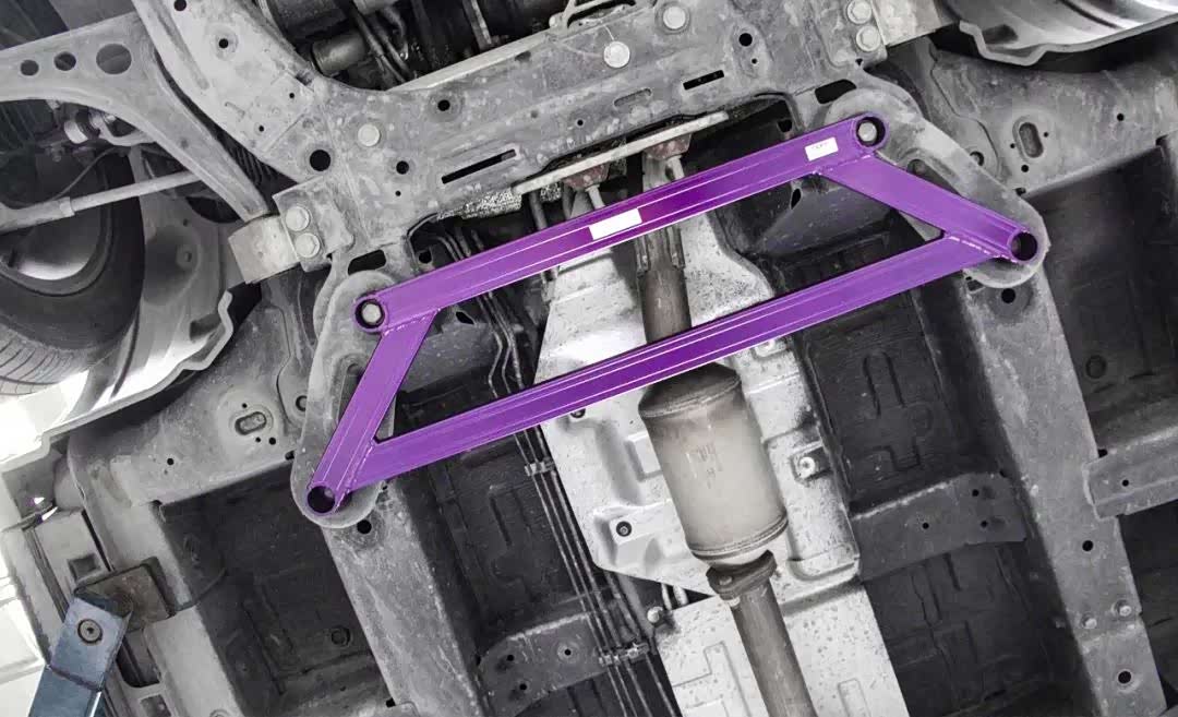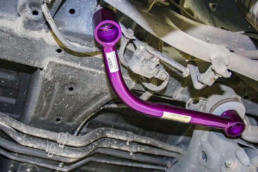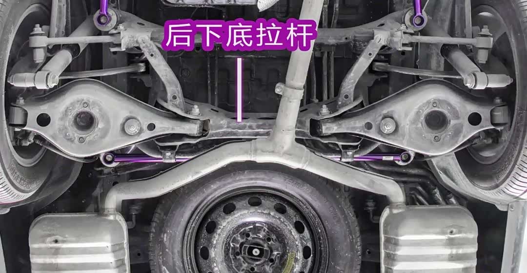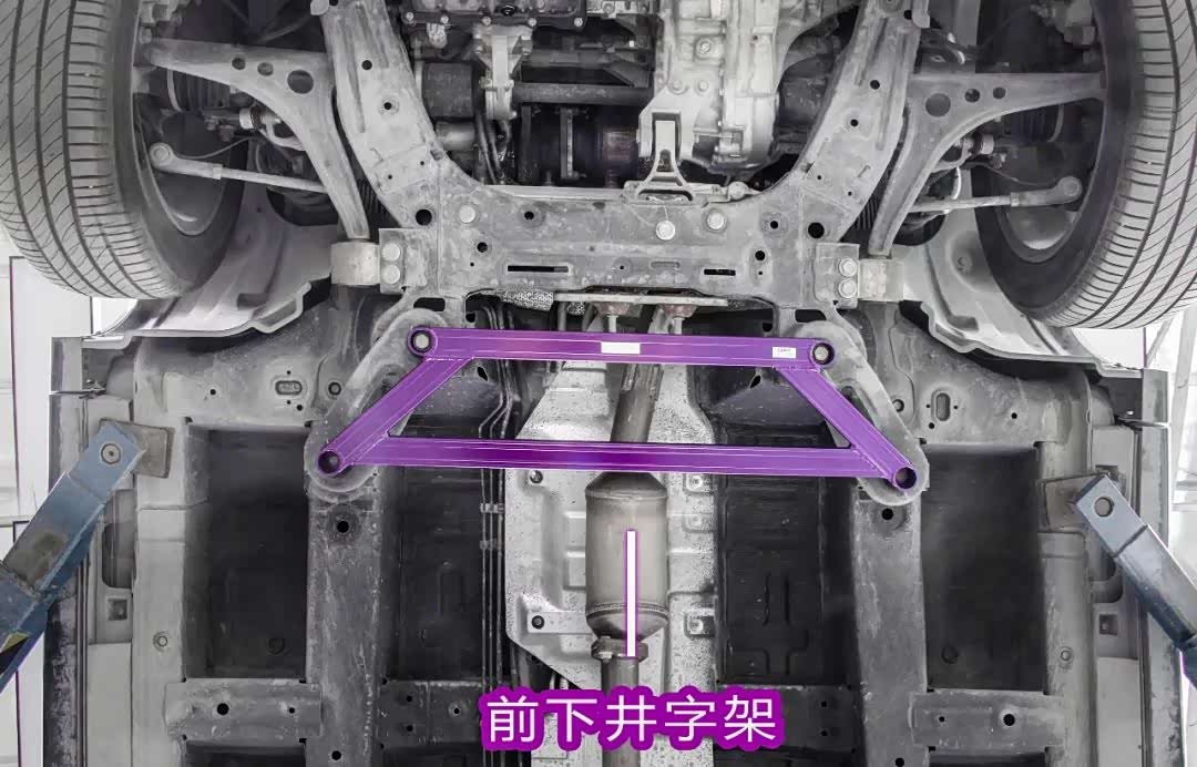 注意观察原车的部分,不难看出厂家本身就为这个连接点设计的相应的连接件,只是出于成本或者是舒适性的需求,两侧都在各自工作。狮特的前下井字架则是将它们连接在了一起,让底盘两侧受力达到协同效果。