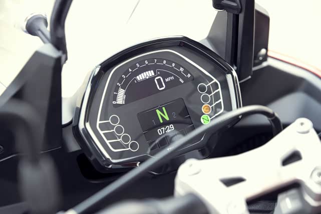Tiger Sport 660重新设计了仪表,虽然尺寸不大但是看起来还算精致。这块仪表支持My Triumph功能,可以提供逐向导航、电话连接和GoPro控制等功能。此外,还配备了可切换的牵引力控制系统,两种骑行模式。