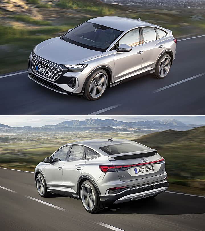 于今年 4 月正式发表的 奥迪 Q4 E-Tron Sportback,采 MEB 电动车模块化平台打造,车身线条结合运动及科技感,车头的单体式水箱护罩由于减少了散热需求,改为大幅降低风阻系数的封闭式设计,但中央仍打造出类似波浪状的造型来增加视觉丰富度。车顶线条从 B 柱开始大幅下削,并与高翘的屁股直接连结,并在后窗下半部拉出小鸭尾的设计。前后轮拱拥有非常明显的外扩造型,是 奥迪 新世代车款必备的特征。