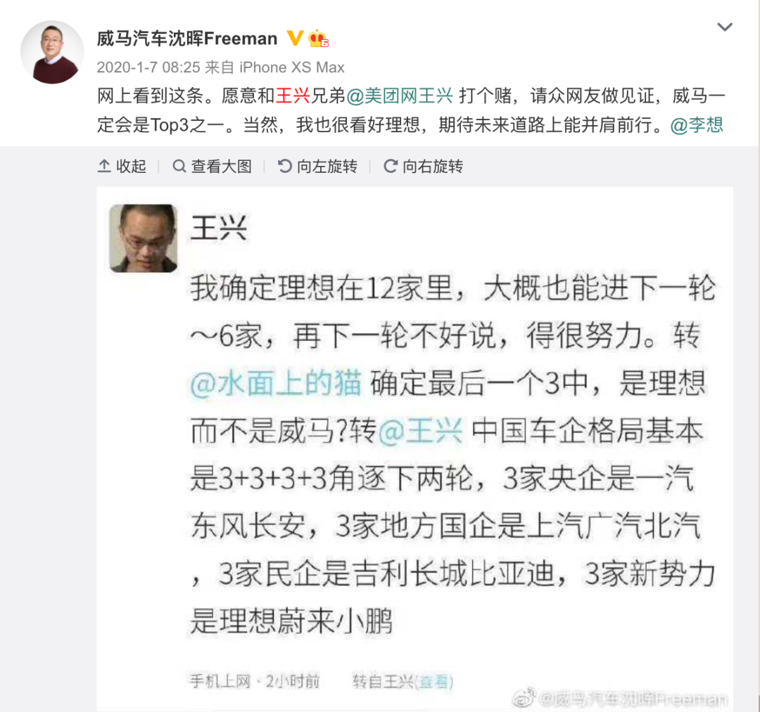 威马汽车正在走下坡路?2019年的时候,美团创始人王兴曾在社交媒体上表示:“中国车企格局基本是‘3+3+3+3’角逐下两轮,除了3家央企、3家地方国企和3家民企,3家新势力是理想、蔚来和小鹏”。针对王兴的看法,威马创始人沈晖表示“威马一定会是TOP3之一”,“威马坚信能够成为全球第一家全年盈利的新造车企业,希望可以跑在特斯拉的前面”。