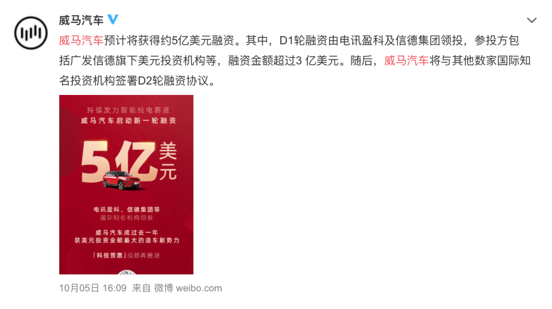 10月5日,造车新势力品牌威马汽车宣布,公司预计将获得约5亿美元新一轮融资。其中,D1轮融资由电讯盈科及信德集团领投,广发信德旗下美元投资机构等参投,融资金额超过3亿美元。随后,威马汽车将与其他国际知名美元投资机构签署D2轮融资协议,预计该轮融资总金额将达约5亿美元。威马汽车计划将该轮融资贷款用于无人驾驶与其他智能化技术和产品的研发,以及销售和服务渠道拓展等。锦沄资本、光源资本以财务顾问身份参与该轮融资。