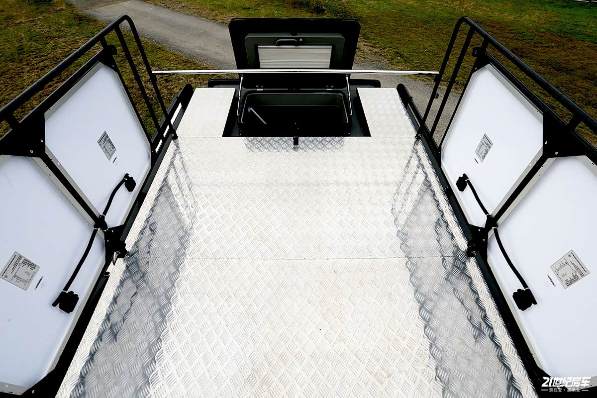 这款车外观最大亮点除了双拓展舱及首创的可伸缩式卫生间外,空中露台绝对是特别的存在,满足日常户外摄影、品茶聊天、生日party、朋友聚会、会议洽谈等多用途场景。此外观景露台的折叠护栏空间被设计成了480W太阳能板。这里注明一下,选装项目包括480W太阳能板、国际新能源快慢充双接口、四路监控。