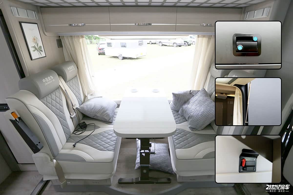 会客区采用双人对卡座沙发设计,头枕和侧面扶手相对实用,软垫保证长途乘坐舒适感,配有3点式安全带;搭配折叠式餐桌可拼成尺寸为1500×1000(mm)的沙发床;座椅下方还有一定储物空间。外推窗提供采光及通风换气效果,推窗上方一排吊柜方便收纳物品。