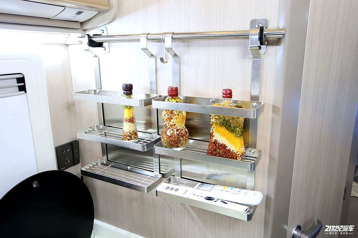 外置抽拉柴油灶整体高度适中,采用单眼设计,内侧操作台可放置用于美食制作的蔬菜或水果;上方内置多功能置物架可存放调料,做饭时方便拿取,十分贴心;行车途中还起到了固定的作用,防止被打翻另外,外置厨房的好处在于防止油烟、油渍进入到车内,便于清洗。后储物舱支持侧面及正后打开方式,正后储物舱门采用上掀式,配有液压杆,操作方便,内部空间可以携带很多旅行中用到的物资;另外,还配有220V五孔插座,用于场景使用。