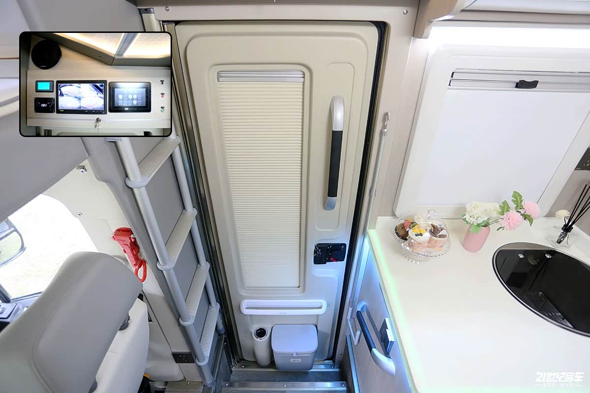 位于乘客门上方的水电中央控制面板采用触摸屏设计,可控制车内照明及各个电器开关;水路系统方面,这款车匹配320升净水箱,60升灰水箱、40L黑水箱。电路部分,搭配600Ah锂电池及3kW+1kW充逆变电一体机(双逆变器)。靠近乘客门处配有多功能安全锤(1把)及伸缩梯(1套)。安全锤便于在紧急时刻可破窗自救,伸缩梯用于置于卧铺床上空中露台使用。