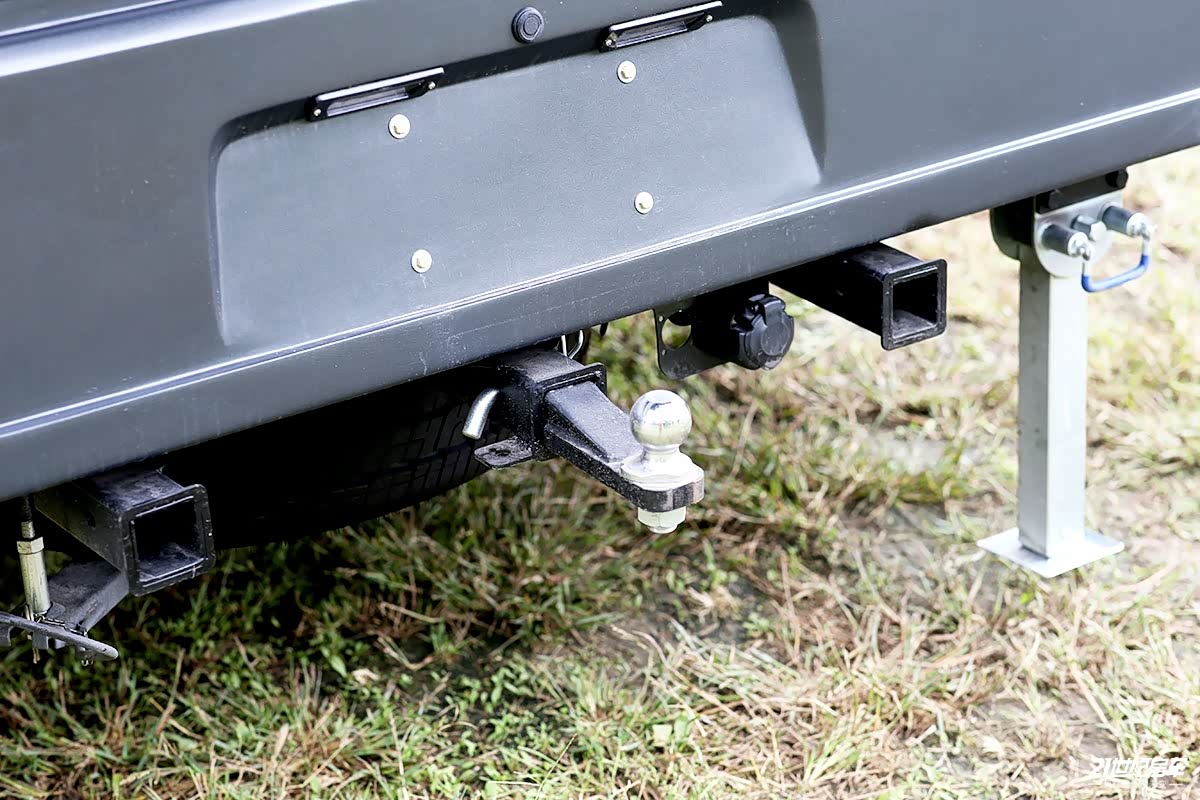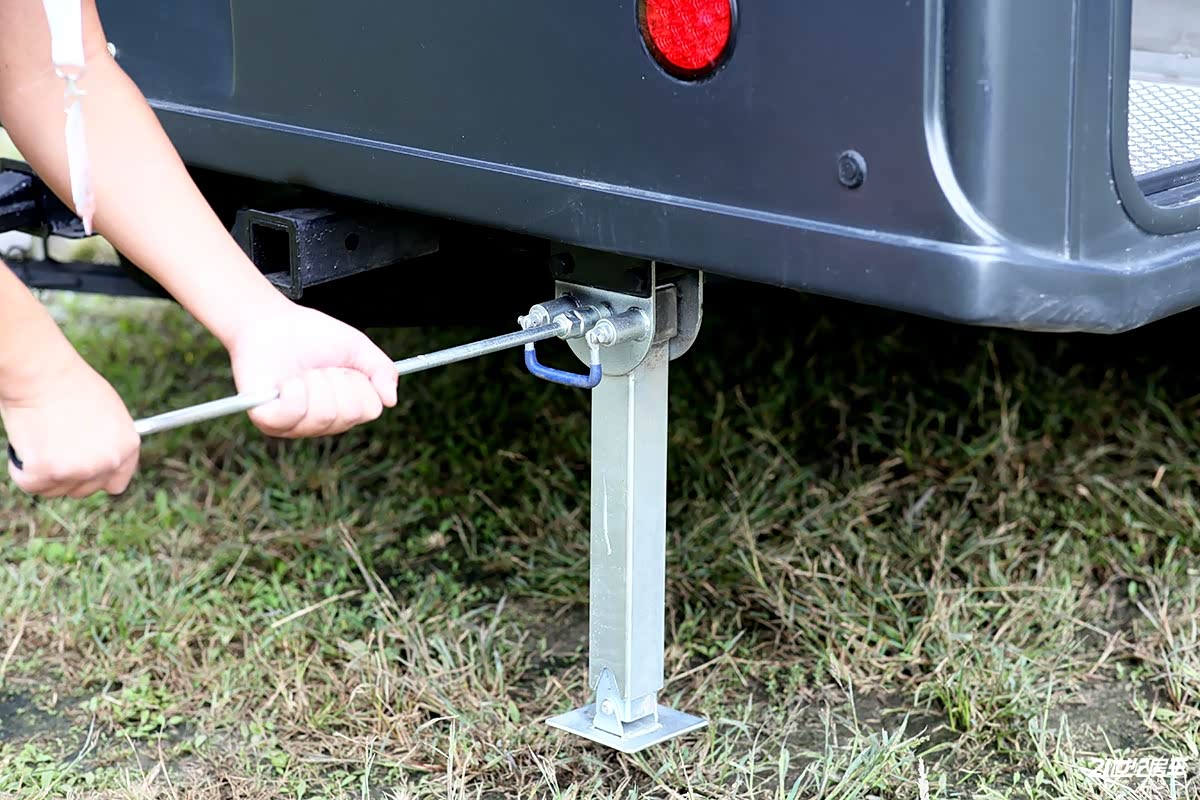 尾部驻车支腿操作便捷,向外拉伸拉手,驻车支腿便可达到自由垂直位置,通过手动摇杆进行升降,完全展开后增加了房车驻车稳定性;此外,三孔拖车杠便于拖拽拖挂式房车,可实现1+1的拖挂组合形式,也可选择装载自行车或摩托车架,让用户既享受了房车生活又能体验了越野摩托的刺激感,可谓一举两得。