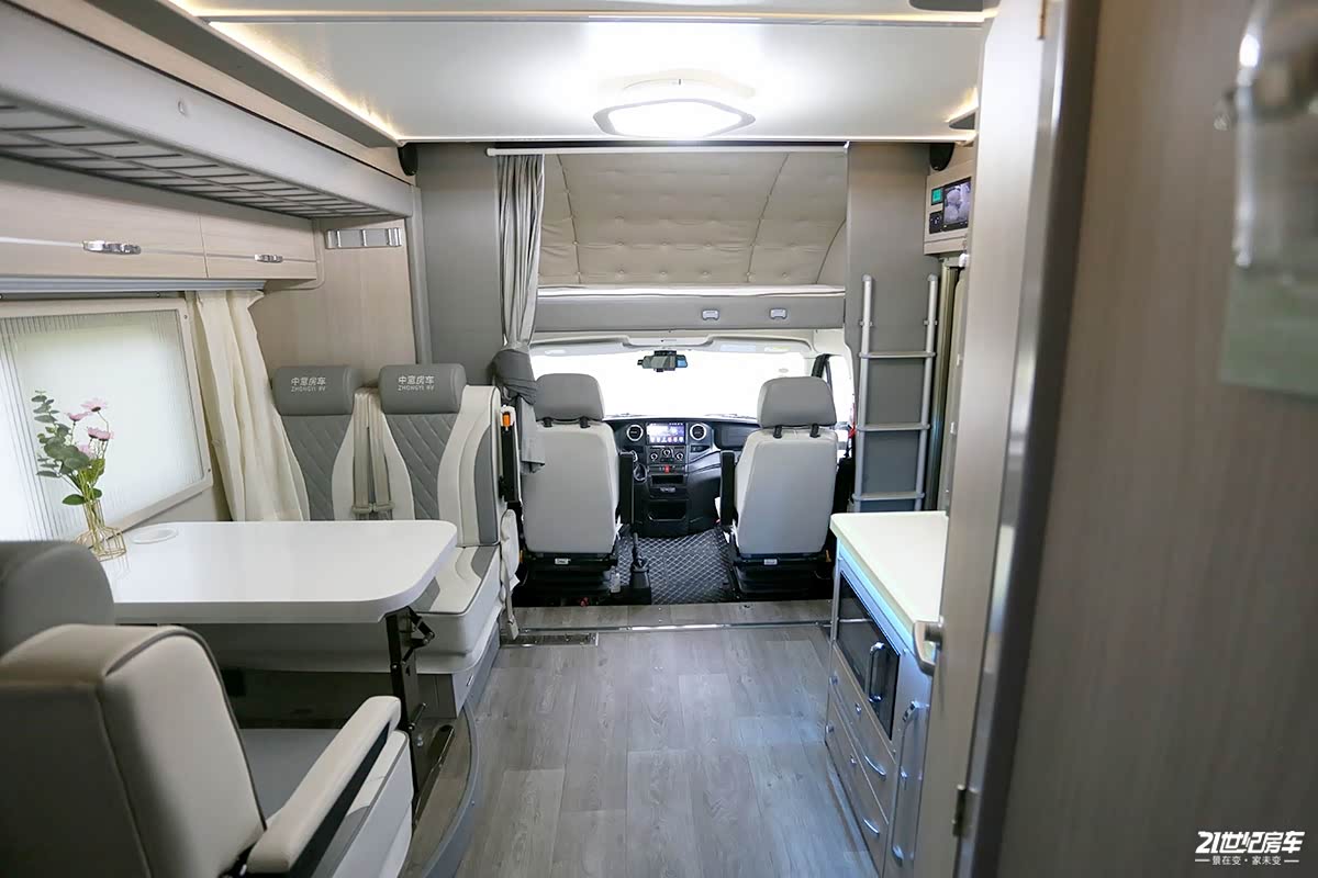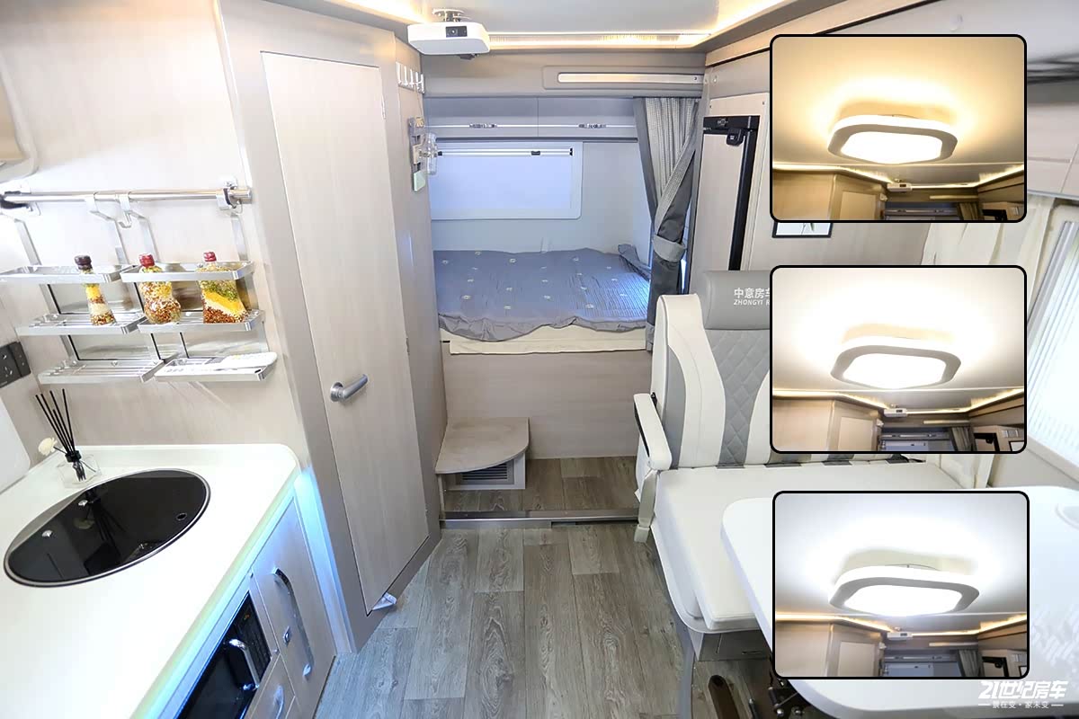 进入车内整体布局一目了然,前额头内饰软包、耐磨地板革突出了实用性。由前向后分别是驾驶舱、额头床+会客区+厨房区及卫生间+横置拓展床的布局结构。各个区域相互独立,划分明确。驾驶区与生活区前后贯通,更有利于进入车内,让乘员享受舒适的生活环境。另外,生活区中央顶部造型灯还提供三种配色,可以根据用户自己的喜好来调整氛围。