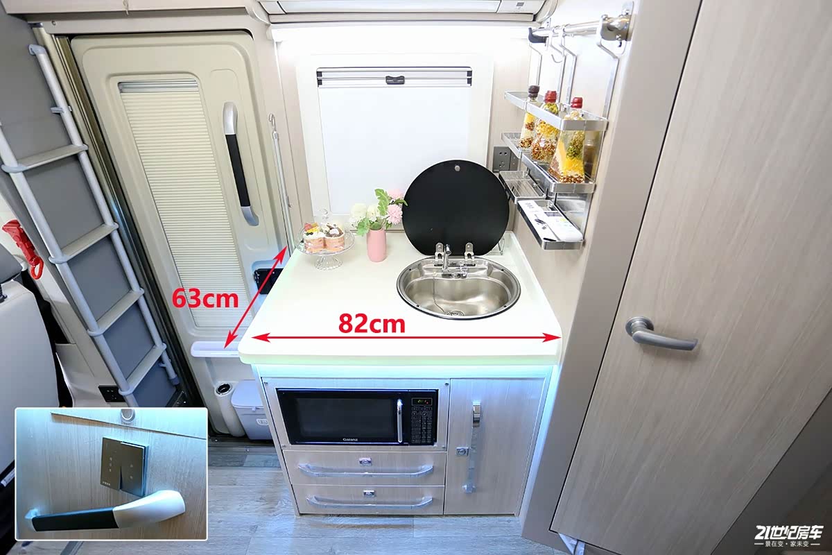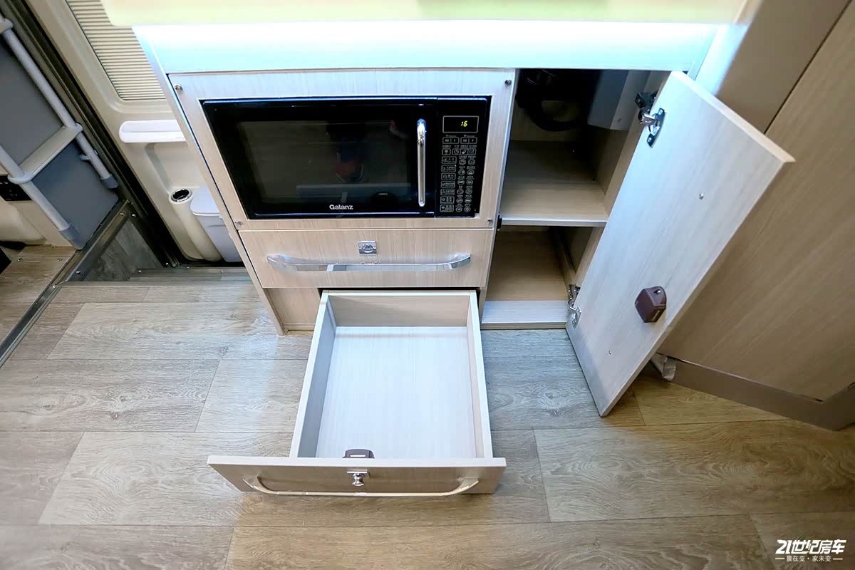 厨房区位于车厢中部,配备带盖式不锈钢洗手池+水龙头;下方多组抽拉式抽屉可放置厨余碗具及食材配料。其它方面包括电磁炉(随车发送)、微波炉、大金家用变频空调、后行车暖风系统、伟巴斯特燃油加热器、烟雾报警器等;可选装四路监控,便于随时观察车外情况,保证车内人员安全。