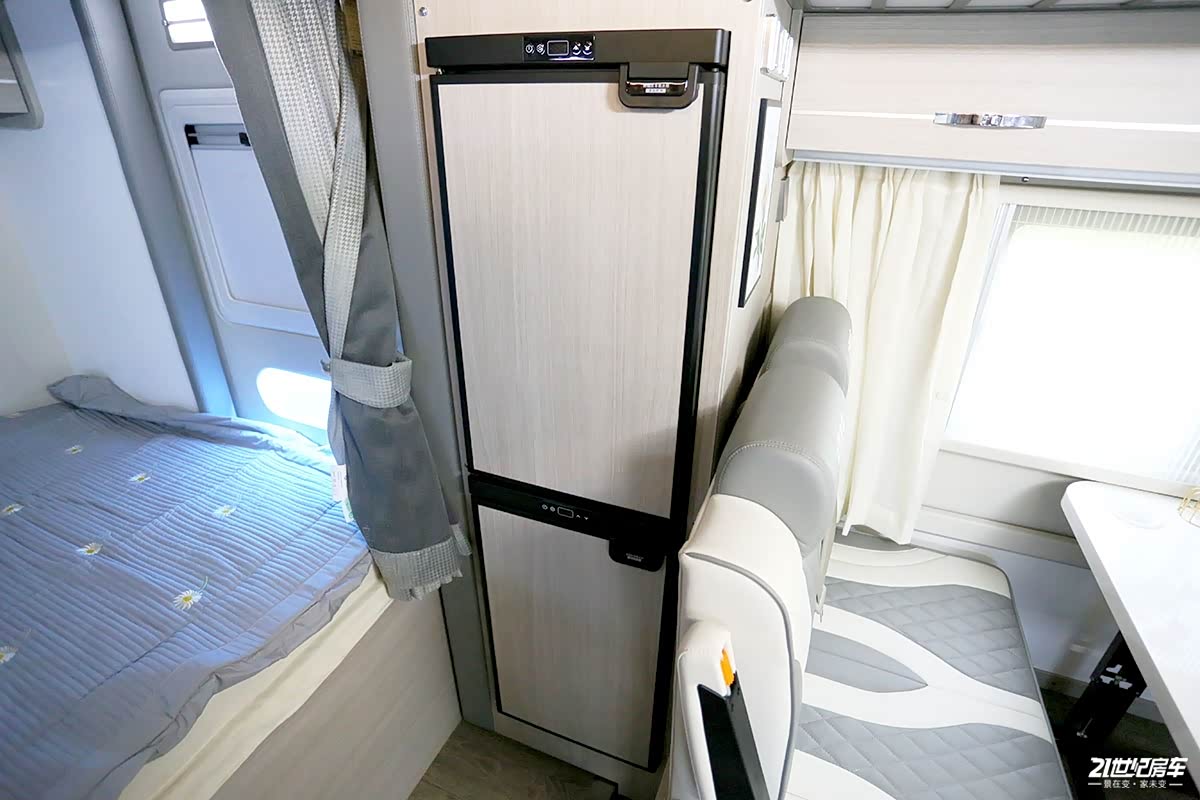 顶部平列三组吊柜收纳空间丰富,横宽62cm,纵深28cm,可以携带很多出行物资。吊柜上方多宫格装饰造型突出了整体视觉感,两侧配有衣帽挂钩。卡座后方一台152L房车专用冰箱,冷藏冷冻都可以,满足长期旅行的食材储备需求。
