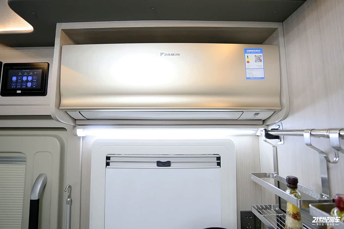 橱柜上方配备有驻车家用变频空调,静音且节能,无需开启逆变器便可正常运行,为车内带来适宜的温度。