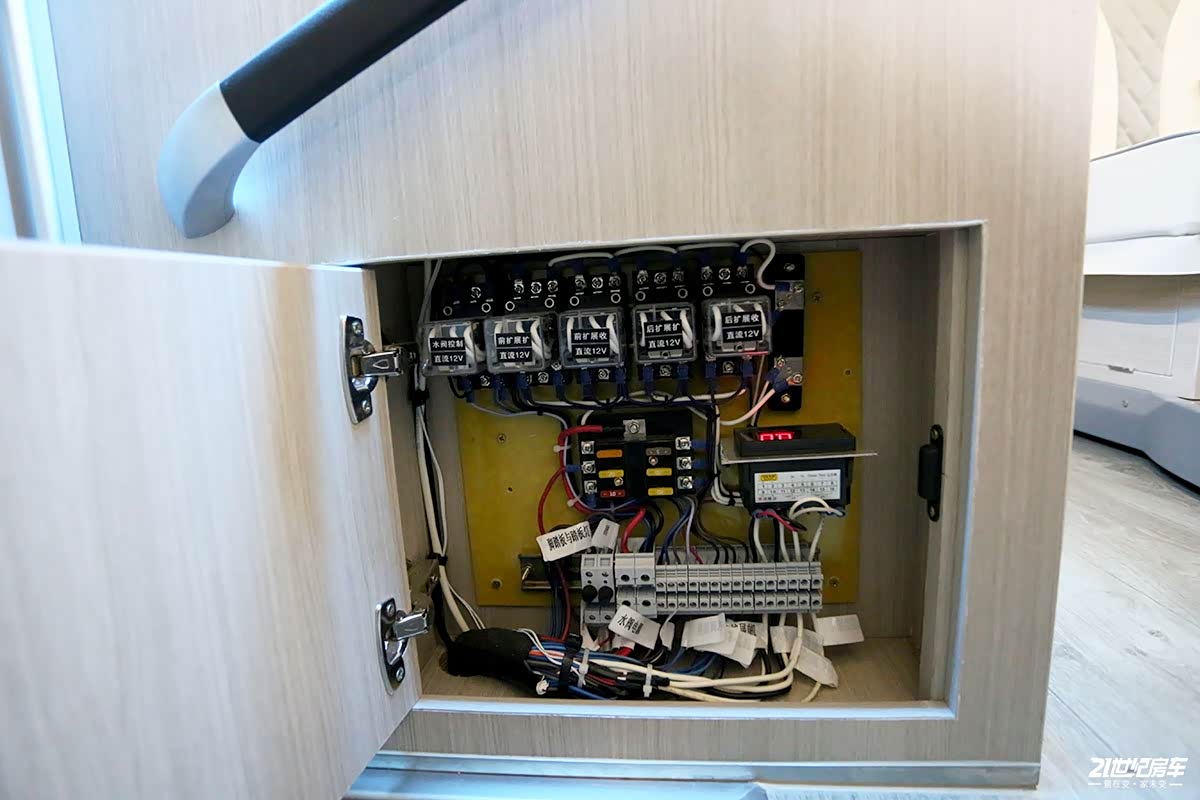 橱柜左侧带有收纳式伸缩桌板,支起后可增大台面操作空间,更利于用户施展厨艺。掀开下方总控开关盖板,是全车电路保险盒,方便用户检修电路系统。