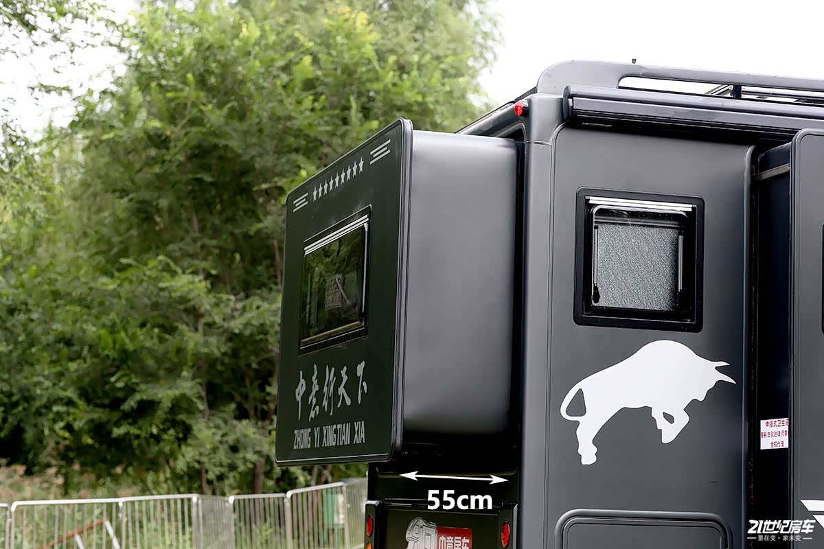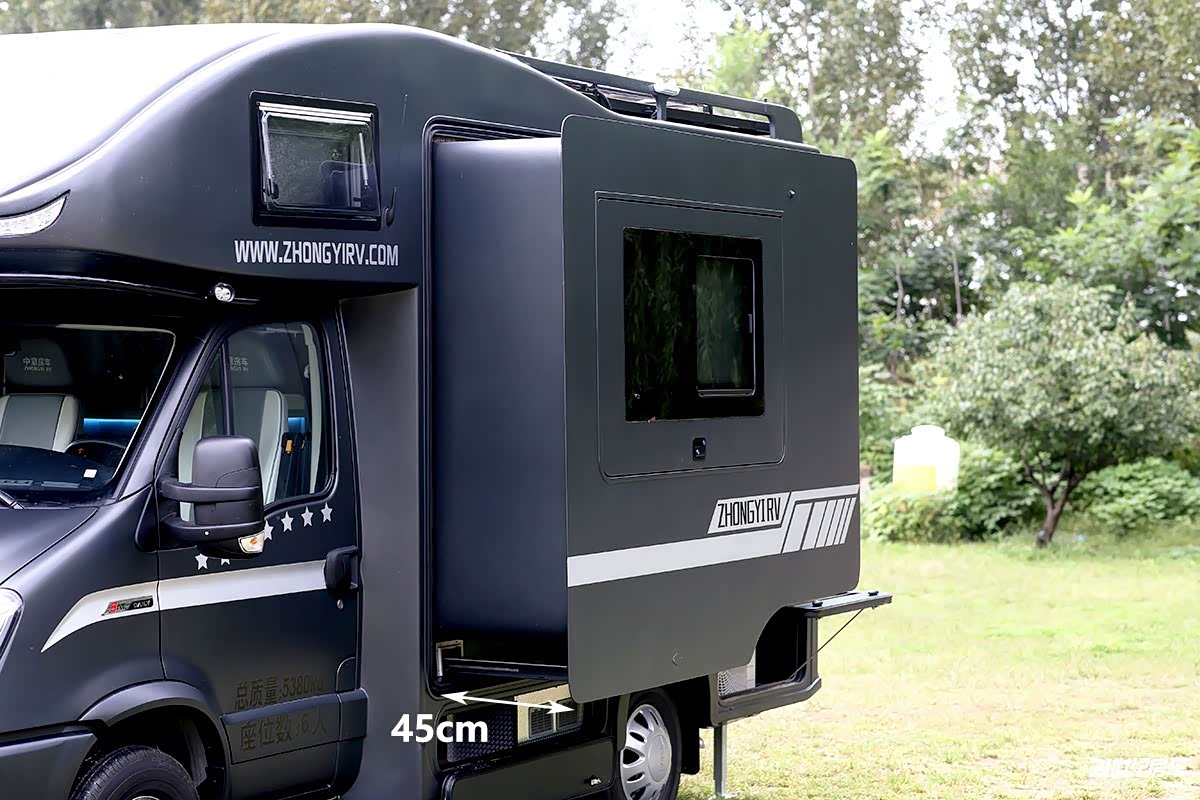 车身左侧、尾部、右侧都带有拓展机构,全部展开后体现出这款极致双拓展专业版所带来的的大空间及高质量房车露营体验,通过实际拓展可看出分别向外延伸出45cm、55cm和32cm。