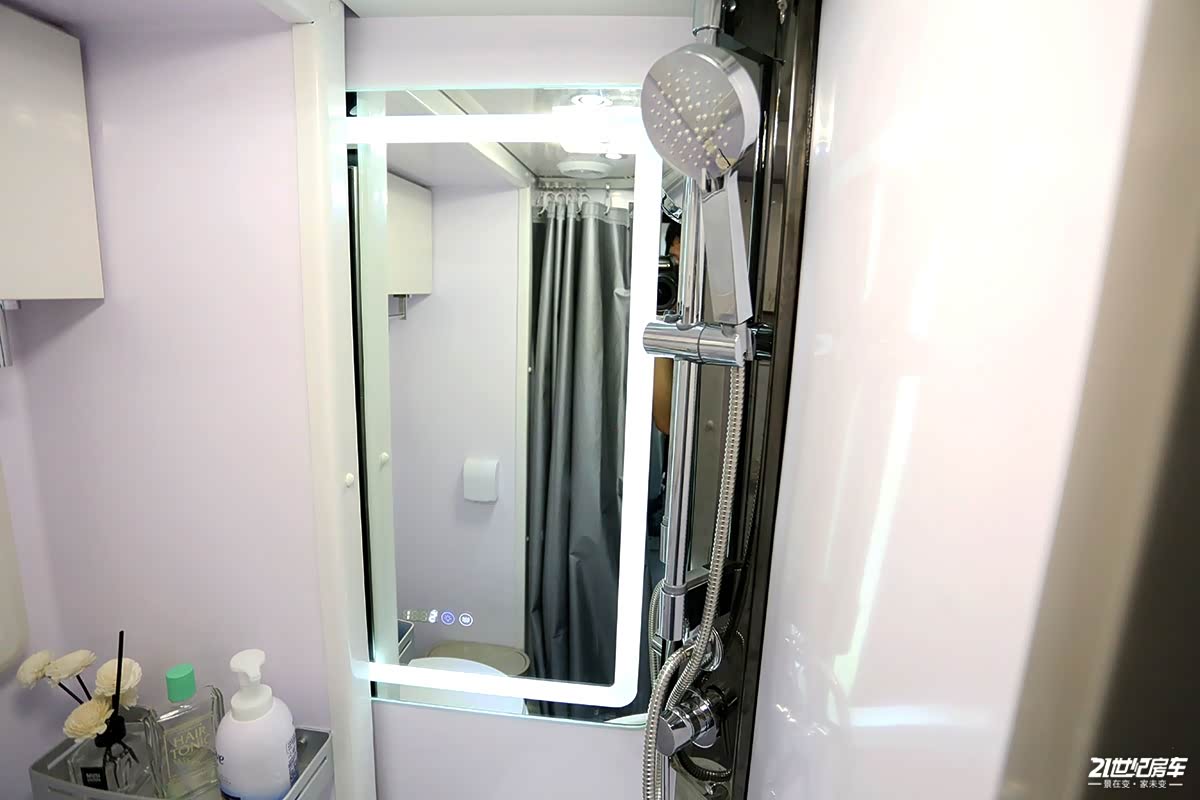 卫生间内壁上触摸式梳妆镜富有科技感,对于夜晚灯光照明不足时非常实用;卫生间灯光控制开关和拓展舱开关表面均由外盖保护,防止淋浴时被溅到,细节贴心。