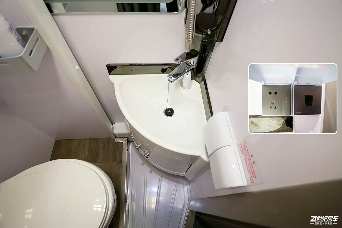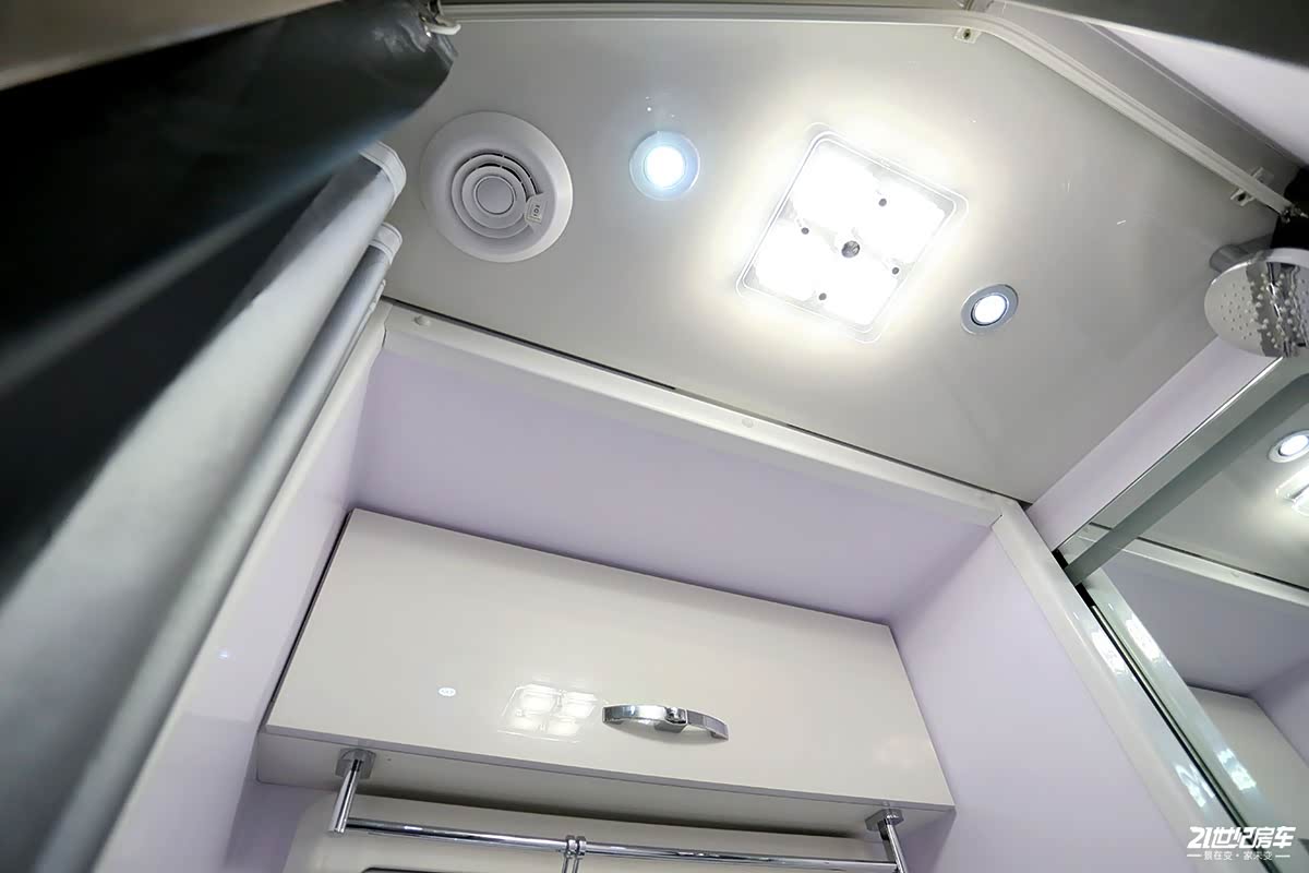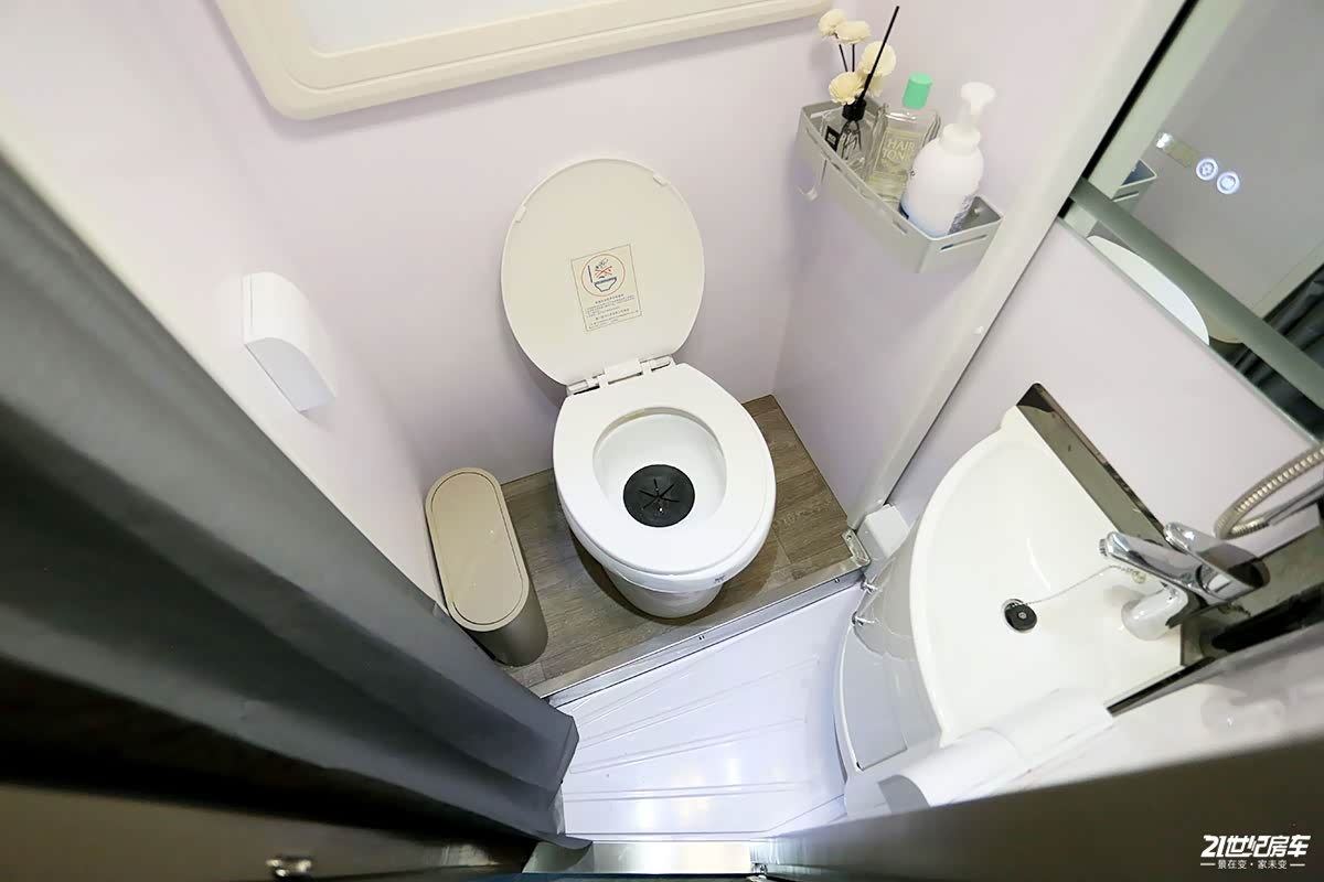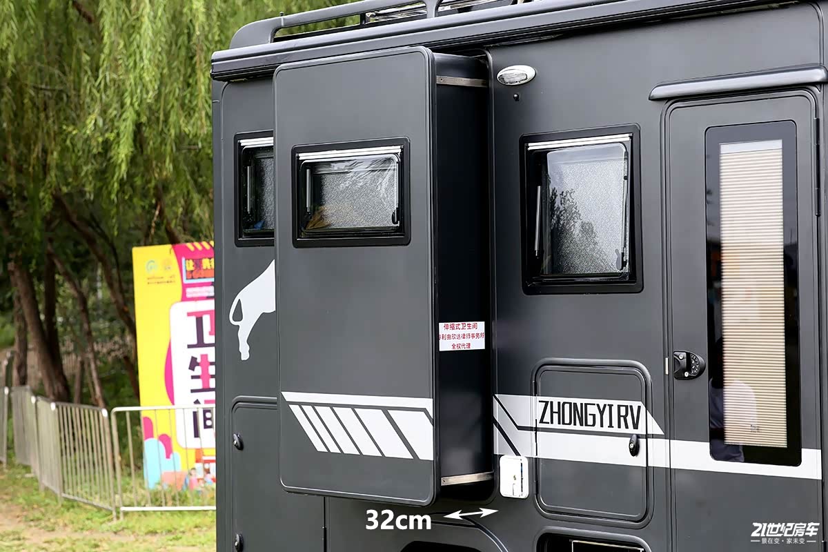 卫生间采用干湿一体式设计,内部配备粉碎式马桶、洗手池、梳妆镜、毛巾架、一体式淋浴花洒等;伸缩式卫生间格局尤为新颖,该项技术已获国家实用新型专利认证,军工品质打造的卫生间拓展机构,严格意义上来讲,属于车体的外延机构,并非定义为拓展舱,设计师当初考虑到空间不足的痛点,将其进行了外部延伸,形成了一个外延机构,即使内部坐人也不会变形,不易发生侧倾等现象,因为拓展舱底部采用槽钢作为支撑,坚固耐用。