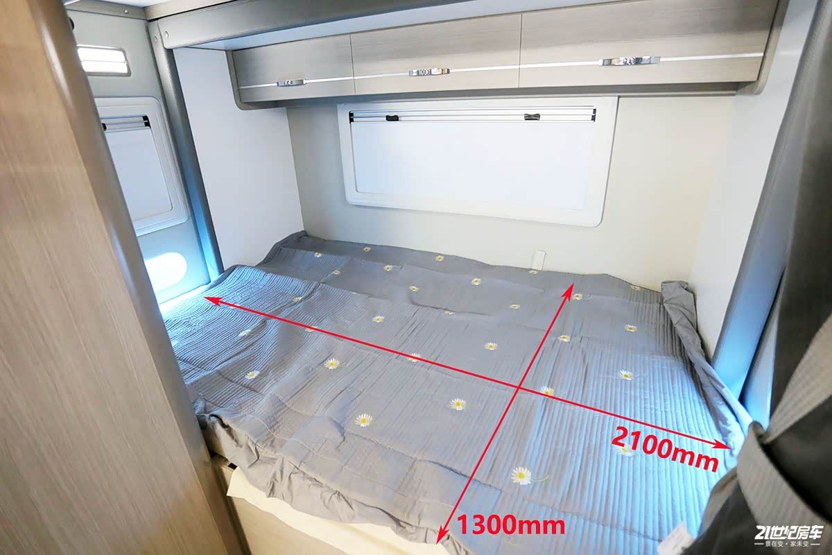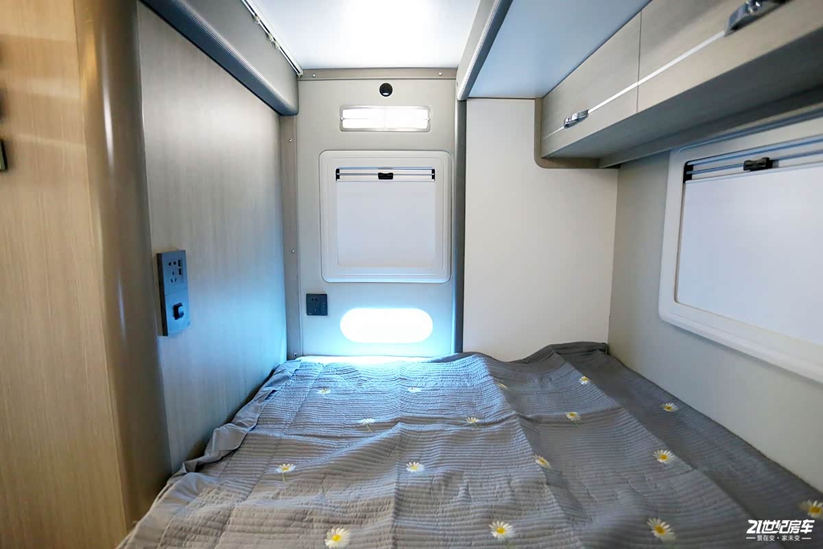 尾部横置床拓展后尺寸为,2100×1300(mm),满足两人睡眠,床垫回弹及支撑性较好;尾部墙壁软包处理后更加美观;两面外推窗提供了充足的采光及通风换气效果;上方多组吊柜可收纳随行物品。